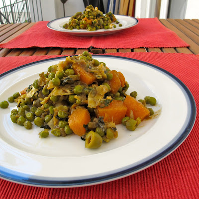Assim apareceu este tajine de ervilhas, bem saboroso, que faz um fantástico almoço vegetariano. Tem a quantidade de proteína e hidratos de carbono necessários para quatro pessoas que sigam uma dieta diabética.